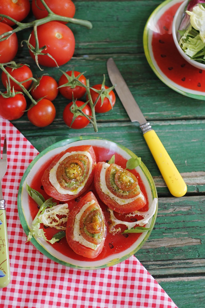 Hoy no os podéis quejar, pues ya traigo una receta sin necesidad de horno y prácticamente sin cocción. He querido hacerle un guiño a la Ensalada Caprese y he hecho una nueva versión, bien dispuesta y haciéndola un poco más atractiva para todos aquellos que no son de ensaladas, que os aseguro que los hay, pues yo conozco a varios, ay, ¡¡con lo ricas que están!!