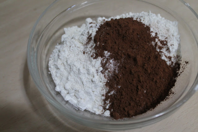 1. Mezcla en un bol la harina junto con el cacao en polvo, el azúcar, la levadura química y la pizca de sal.