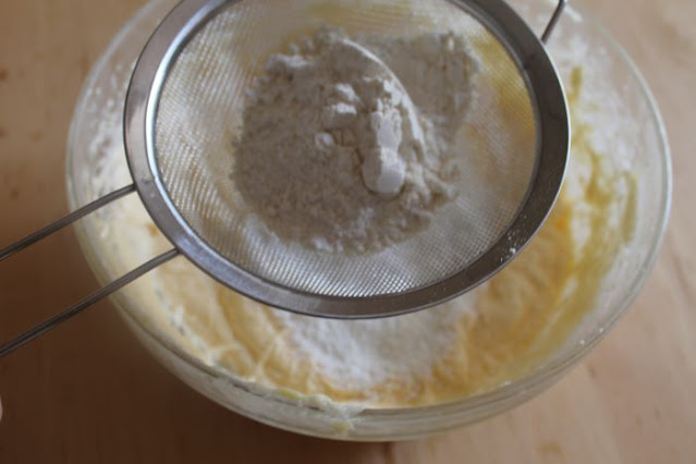 3. Mezcla la harina junto con la levadura química y la sal. Tamiza la mitad de la harina sobre el bol anterior y mezcla esta vez con una espátula removiendo bien.